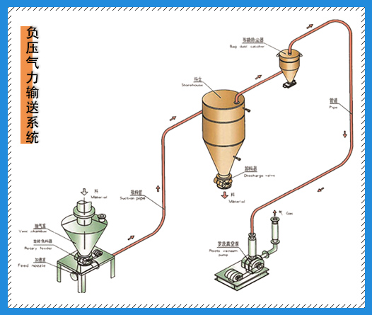 正負壓稀相輸送,料氣比大約為0~30,為粒體懸浮于氣流中,可根據正負壓各自輸送距離與產量來合理選定出動力源風量與風壓,亦可根據不同工況,組合成不同形式的正負壓一…
